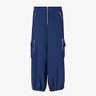 Parachute trousers with adjustable elastic inserts at the waist and hem. Side zipped pockets, patch cargo pockets with flap on the sides and pocket on the back-left. Zip closure on the front. Made of blue wool gabardine. Finished with zip details on the cargo pockets and along the sides. Left cargo pocket finished with matching embroidered FF Selleria.