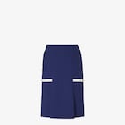 Straight-cut midi skirt with symmetrical slits at the front. Contrasting elastic straps on the sides, with buttonhole adjustment, to modify the fit and define the volume of the silhouette. Side pockets and zip fastening on the left side. Made of dark blue lightweight mohair. Lined in micro FF jacquard in the same tones.