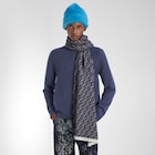 Rectangular scarf made of wool micro FF Jacquard in light grey and blue. Embellished with small white fringes at the ends.