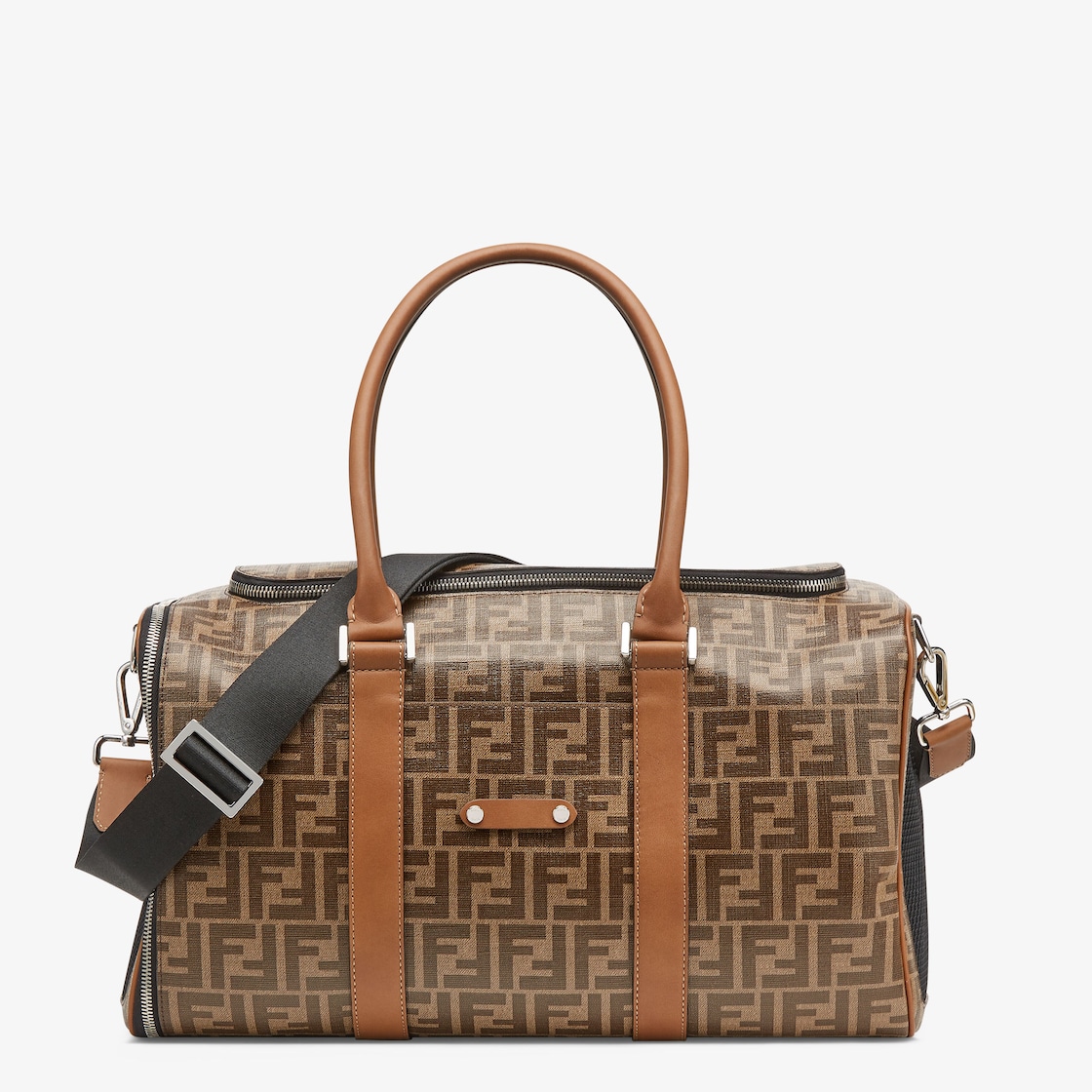 Dog carrier with double handle and detachable webbing shoulder strap. Two double-slider zip openings and mesh net inserts at the sides. Made of fabric with FF motif in brown and tobacco, embellished with leather details and customisable tag. Features an FF fabric removable cushion. Palladium-finish metalware.
