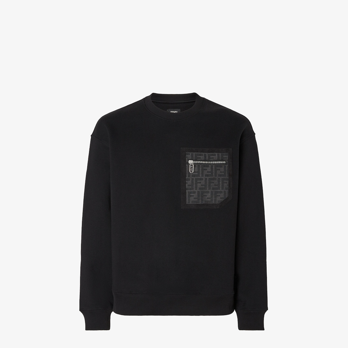 Long-sleeved crew-neck sweatshirt. Ribbed finish on neckline, cuffs and hem. Made from black cotton jersey. Embellished with leather patch pocket on the chest with FF motif.