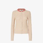 Long-sleeved crew-neck cardigan. Covered button fastening in matching tone. Made of beige cotton yarn with all-over Argyle motif embroidery and openwork FF details. Ribbed cuffs and edge, crew neck finished with red striped motif.