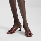 Slides almond-shaped toe and double band embellished with a bow. Made of shiny burgundy nappa leather. Sculpted high-heel covered in tone-on-tone nappa leather, completed by a gold-colour metal bar engraved with the Fendi logo.