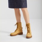Lace-up Fendi Filo combat boots with round toe. Made of light ochre water-resistant nubuck leather embossed with the iconic FF motif tone-on tone. Fastening with two-tone hiking laces and metal eyelets. Decorated on the back by the Selleria Metal Stitch in a gold-finish. Rubber sole and heel with Fendi lettering on the side.