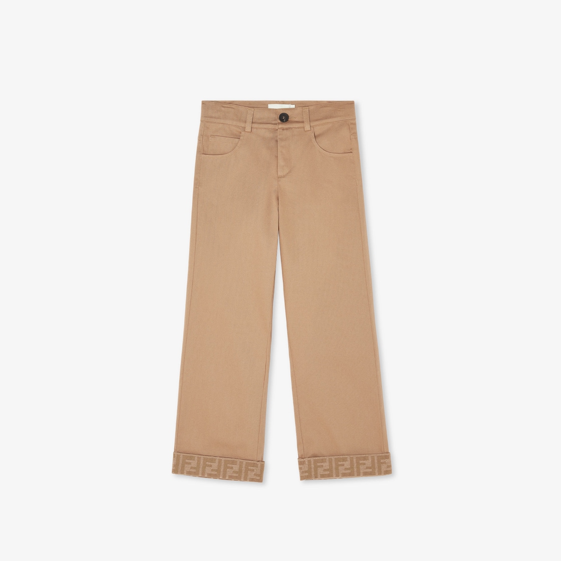 Pantalone junior a gamba dritta in gabardina beige con risvolto sul fondo in canvas con logo FF tone on tone.