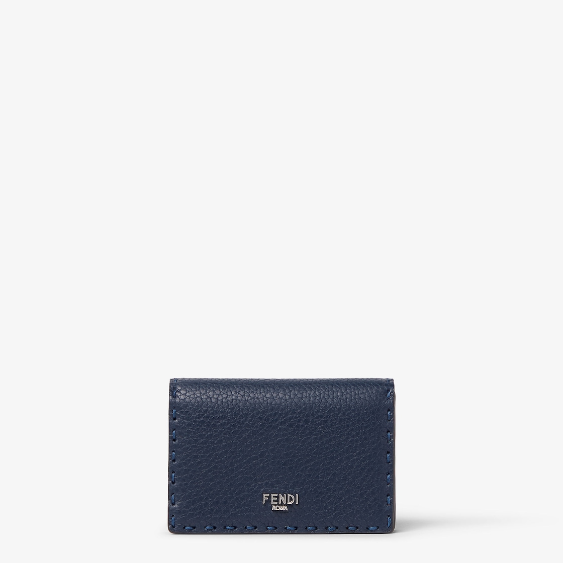 Tarjetero con solapa con dos bolsillos planos, compartimiento central y bolsillo plano en la parte trasera.Confección en piel Cuoio Romano de becerro color azul oscuro y acabada con 102 macropespuntes hechos a mano, un emblema de la icónica elaboración Selleria, transmitida por los artesanos de Fendi desde 1925.Forro de piel color rojo oscuro en contraste.Accesorios de metal con acabado de paladio.
