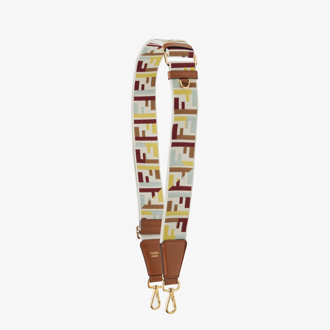 Correa de hombro larga ajustable con doble pinza para usar en combinación con cualquier bolsa con ganchos.Confección en cincha blanca con el icónico motivo FF jacquard multicolor.Acabada con detalles de piel café.Accesorios de metal con acabado dorado.