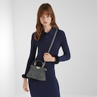 Se puede llevar en la mano, en el hombro o cruzado mediante el asa y la correa de hombro ajustable y desmontable.