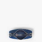 Se puede llevar en el hombro gracias al asa de piel azul oscuro ajustable y desmontable.