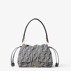 Confección en jacquard FF efecto mezclilla en tono azul oscuro y adornado con broche FF con aplicación de piel color azul oscuro.