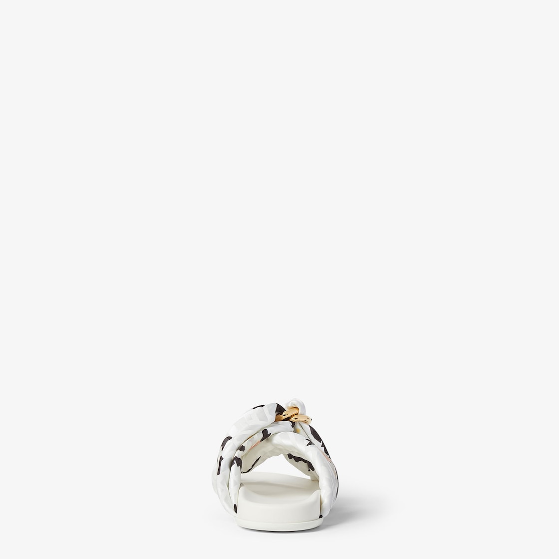Sandalias tipo chancla plana con doble banda acolchada y hebilla decorativa de anillo D con inscripción tridimensional de letras Fendi.Confección en satín jacquard FF con estampado Fendi Bouquet en blanco, negro y rosa claro.Plantilla de piel blanca.Accesorios de metal con acabado dorado.