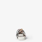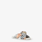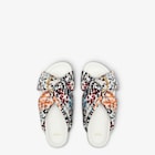 Sandalia tipo chancla plana con doble banda acolchada y hebilla decorativa D-ring con inscripción de letras Fendi tridimensional.Confección en satín en tonos blancos con fantasía multicolor Dew Drops estampada.Plantilla de piel blanca.Accesorios de metal con acabado dorado.
