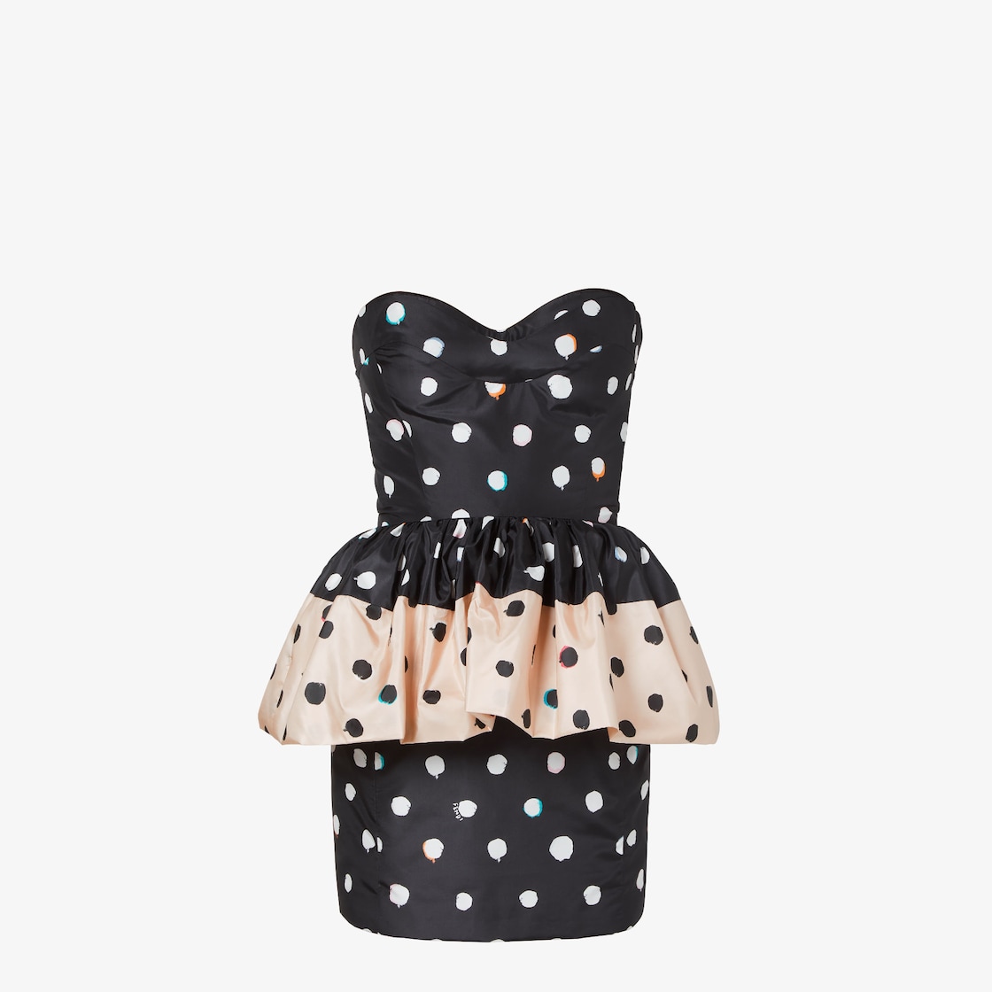 Vestido bustier corto con escote corazón y péplum en la cintura.Cuenta con cierre en la parte trasera.Confección en tafetán color negro y rosa adornado con motivo all over Falena Dots estampado en tonos en contraste e inspirado en un vestido efectivamente usado por Silvia Venturini Fendi en los años ochenta.
