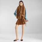 Estola oversize con cinturón multifuncional de piel en los mismos tonos.Confección en zorro café.Acabada con forro de seda tono sobre tono.Accesorios de metal con acabado dorado.