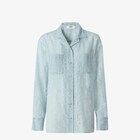 Camisa de manga larga con cuello de bolera y bolsillos de parche en el pecho.Cierre con botones.Confeccionado en tejido de mezcla de seda y viscosa azul claro, adornado con un patrón Pequin desgastado con detalles FF.Las mangas están terminadas con secciones recortadas en el dobladillo y puños anchos y extragrandes.