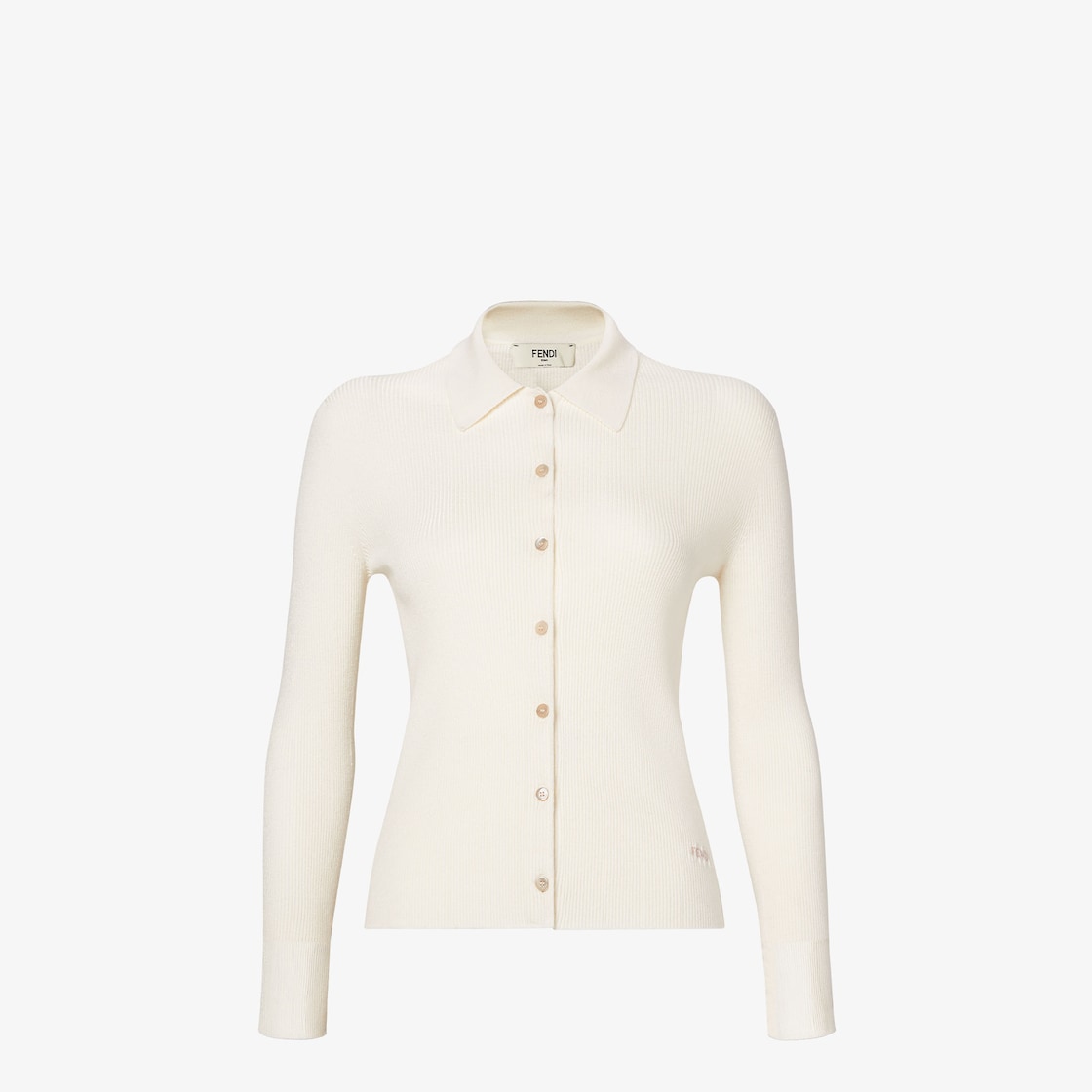 Cárdigan de corte slim con cuello de camisa y manga larga.Presenta cierre con botones de nácar.Confección en punto blanco con elaboración acanalada.Acabado con letras Fendi en intarsia en contraste en el lado izquierdo.