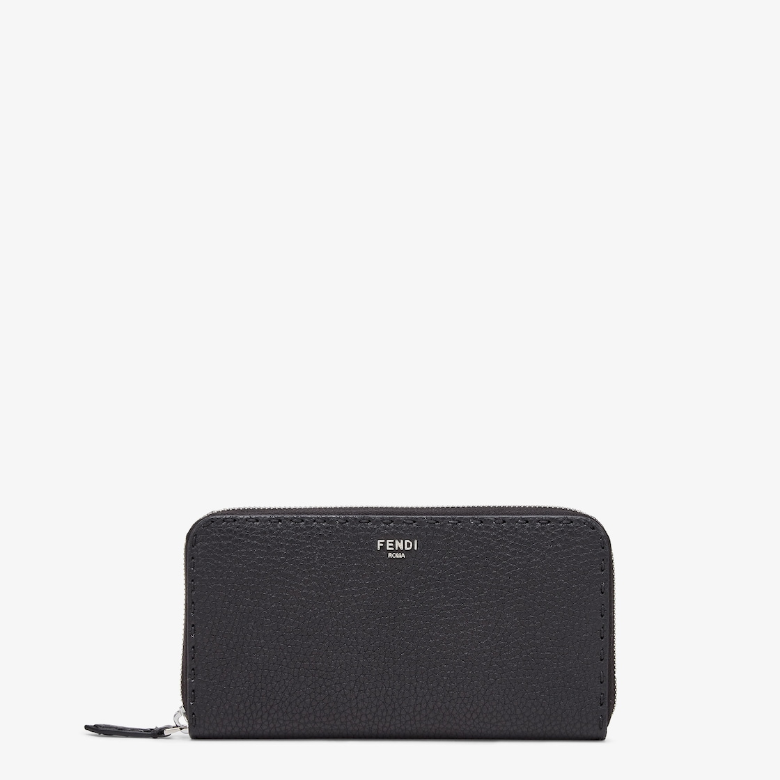 Cartera con cremallera. Dispuesta en tres compartimentos extensibles, con ocho ranuras para tarjetas y un bolsillo con cremallera. Confección en piel Cuoio Romano negra. Acabada con inscripción Fendi Roma y bordes decorados con costuras Selleria hechas a mano. Accesorios metálicos con acabado en paladio.