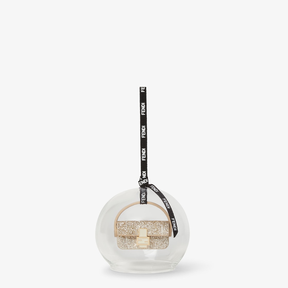Bola para decorar el árbol de Navidad confeccionada en vidrio soplado transparente, adornada con listón fino de grogrén negro personalizado con logo Fendi.El interior presenta una miniatura exquisita de la bolsa Baguette de tejido con brillantina y detalles de piel laminada dorada.Cuenta con broche con micromotivo FF y de detalles de metal con acabado dorado.