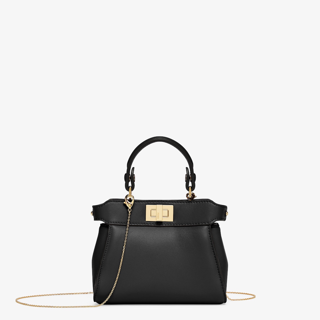 La icónica bolsa Nano Peekaboo con todos los detalles reconstruidos. Cuenta con interiores forrados en piel, dos compartimentos divididos por una partición rígida, asa desmontable con dos botones a presión y el emblemático cierre de giro. Se puede llevar en la mano o de cuerpo cruzado gracias a la correa de hombro de cadena fina. Confección en piel napa negra. Accesorios de metal con acabado dorado.