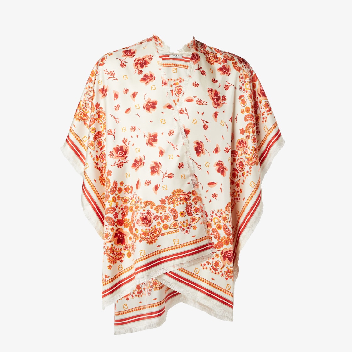 Poncho de seda pura con cordones laterales. Confeccionado en seda de color blanco marfil. Personalizado con estampado de pañuelo Coral adornado en el centro con un delicado patrón de detalles florales, corales y micro FF en tonos rojos. Enmarcado por rayas en bloques de color y bordes desflecados.