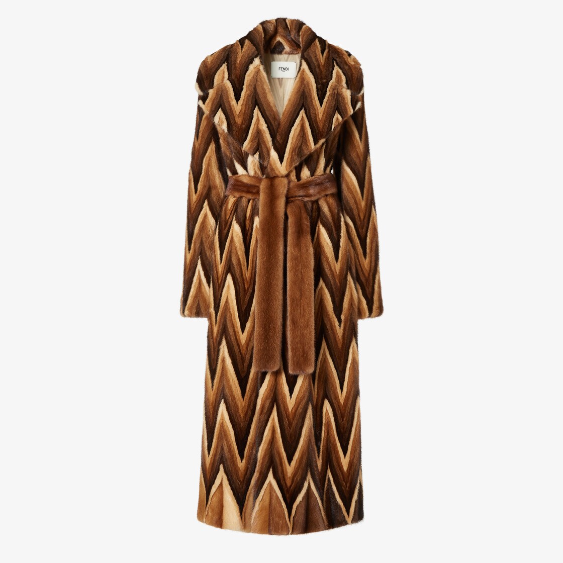 Abrigo largo de volumen wrappy con cuello amplio con solapas y cinturón a juego. Confección en visón con motivo chevrón elaborado en intarsia, inspirado en un diseño de archivo Fendi. La confección en lomos enteros crea un efecto tridimensional en sus tonos naturales, desde el café claro hasta el más oscuro. El forro de ligera organza deja entrever la intarsia, enfatizando la complejidad de la elaboración.