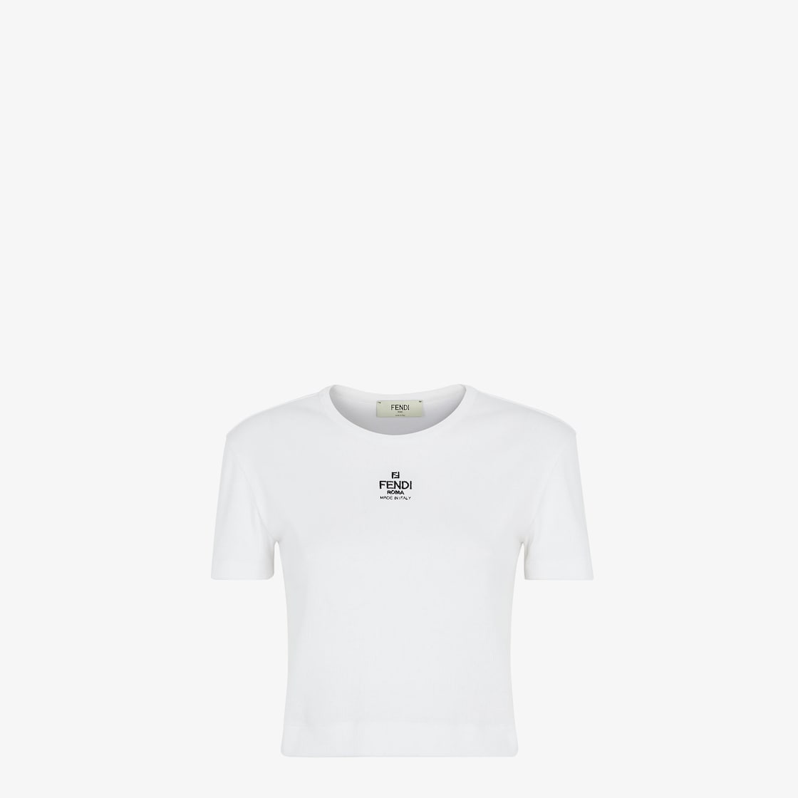 Top corto de corte slim con escote redondo y manga corta. Confección en punto de algodón blanco acanalado. Modelo personalizado con logotipo pequeño "FENDI ROMA MADE IN ITALY" estampado en contraste en la parte delantera.