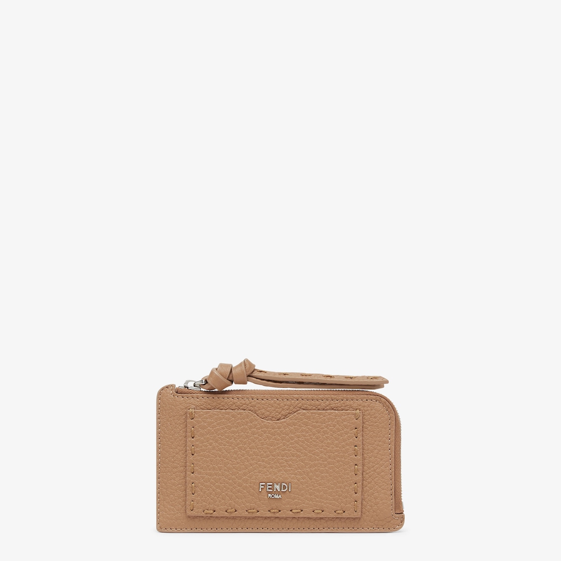 Tarjetero Peekaboo con 4 ranuras para tarjetas en la parte posterior, 1 en el frente y 1 compartimento central con cremallera. Confeccionado en piel Cuoio Romano de becerro color capuchino con 62 macropespuntes tono sobre tono hechos a mano, un emblema de la exquisita elaboración Selleria, transmitida por los artesanos de Fendi desde 1925. Accesorios de metal y logotipo FENDI de metal con acabado paladio.
