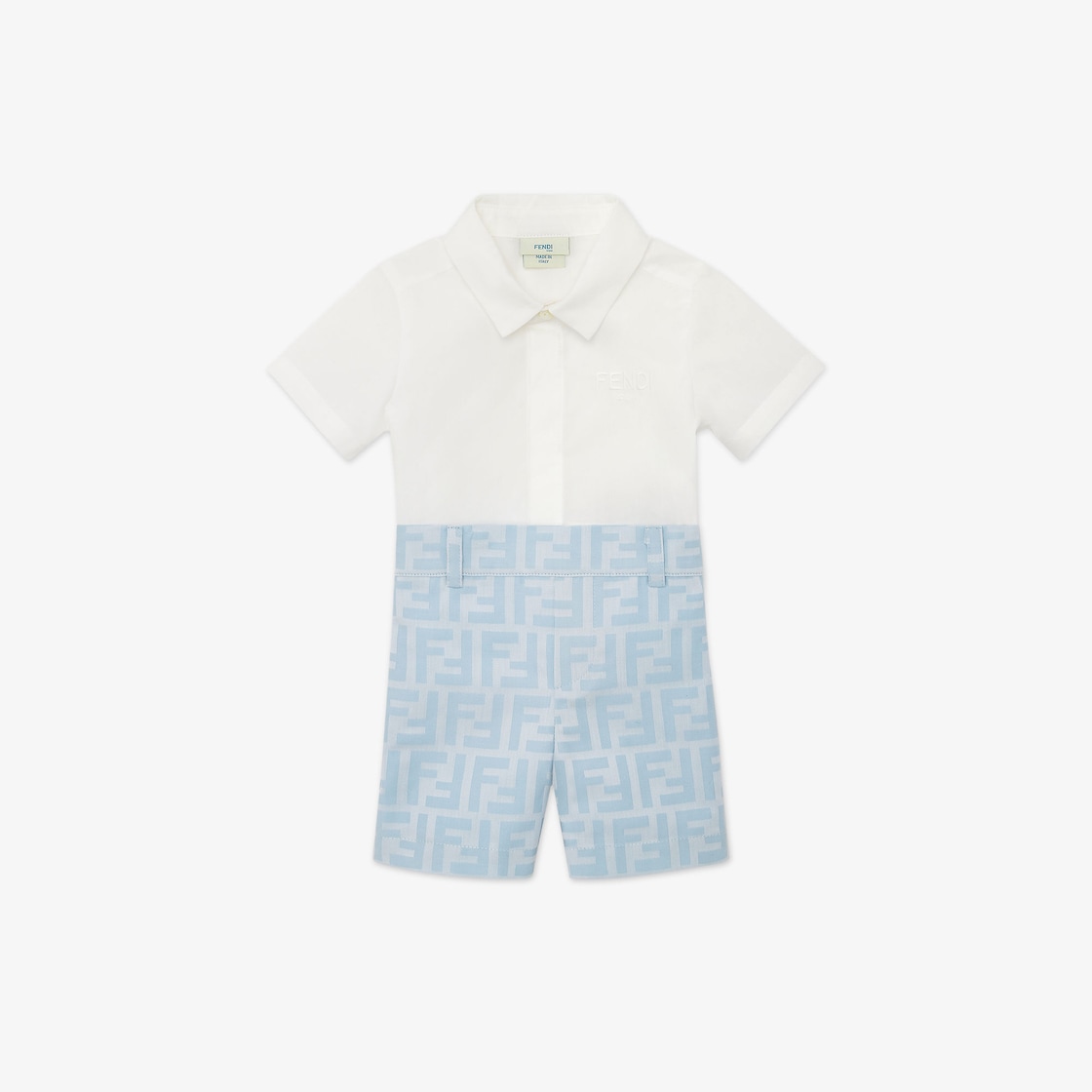 Piyama corta de una pieza para bebé, de popelina con logotipo Fendi Roma a tono en la camisa color blanco gis; la parte inferior es un short azul claro con pinzas FF tono sobre tono por toda la prenda.