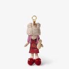 Adele bag charm made of suede with pink nappa leather hair and a beige knitted hat. Red nappa leather dress with embroidery depicting a persimmon and Fendi lettering. The charm features a peanut in crocheted cotton. Red shearling shoes and pink Lycra socks. Leather loop with snap hook and hot-stamped Fendi Roma logo on the back. Gold-finish metalware. Perfect for customising the look of the collection bags.