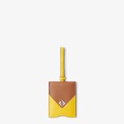 Travel address holder with removable tag and AirTag holder slot on the back. Made of yellow and sellier brown full-grain leather. Decorated with metal FF logo appliqué in a palladium finish. Strap to attach it to bags and suitcases.