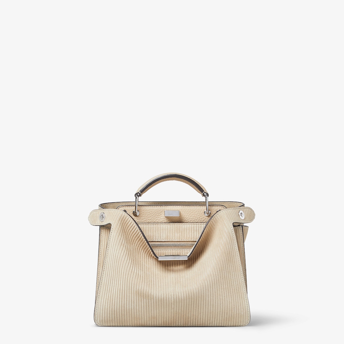 Small Peekaboo ISeeU bag, made of beige suede printed with a texture that mimics corduroy. Lining in tone on tone Cuoio Romano leather.