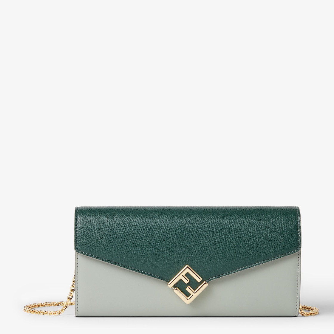 FF Diamonds continental wallet with geometrically shaped flap, diagonal FF logo and fine, removable chain strap. The interior features a wallet layout with two gusseted compartments, a zip pocket, two flat pockets and ten card slots. Made of smooth calfskin and full-grain leather in matcha green and dark green. Gold-finish metalware.