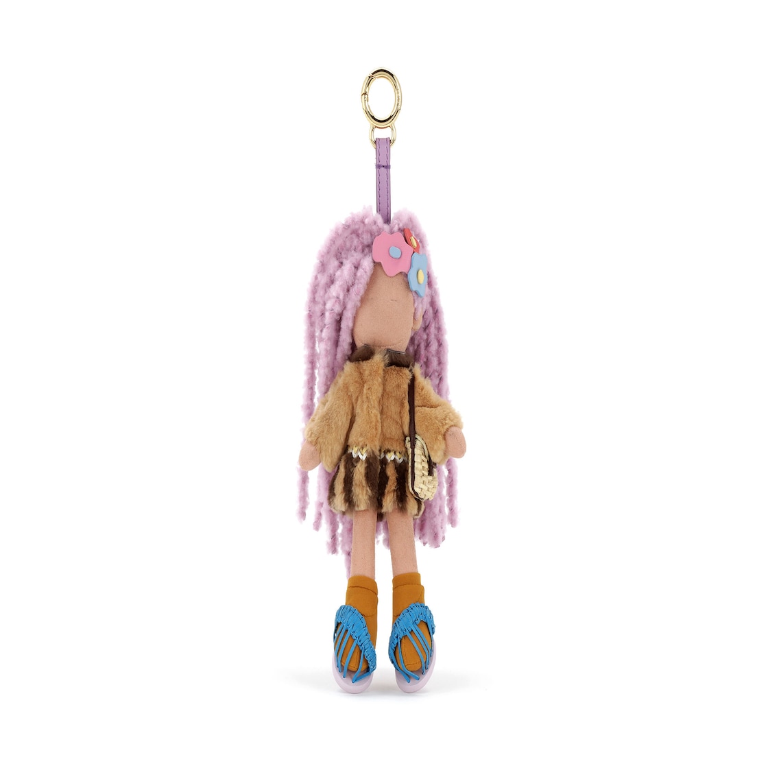Emma bag charm made of microfibre with lilac shearling hair and multicoloured leather Sunny Side Flowers decorations. Mink dress with leather details and two-tone inlay at the hem. Raffia handbag that recreates the iconic Baguette shape. Light blue braided leather sandals with white leather insole. Leather loop with snap hook and Fendi Roma logo. Gold-finish metalware. Perfect for customising the look of the collection bags.