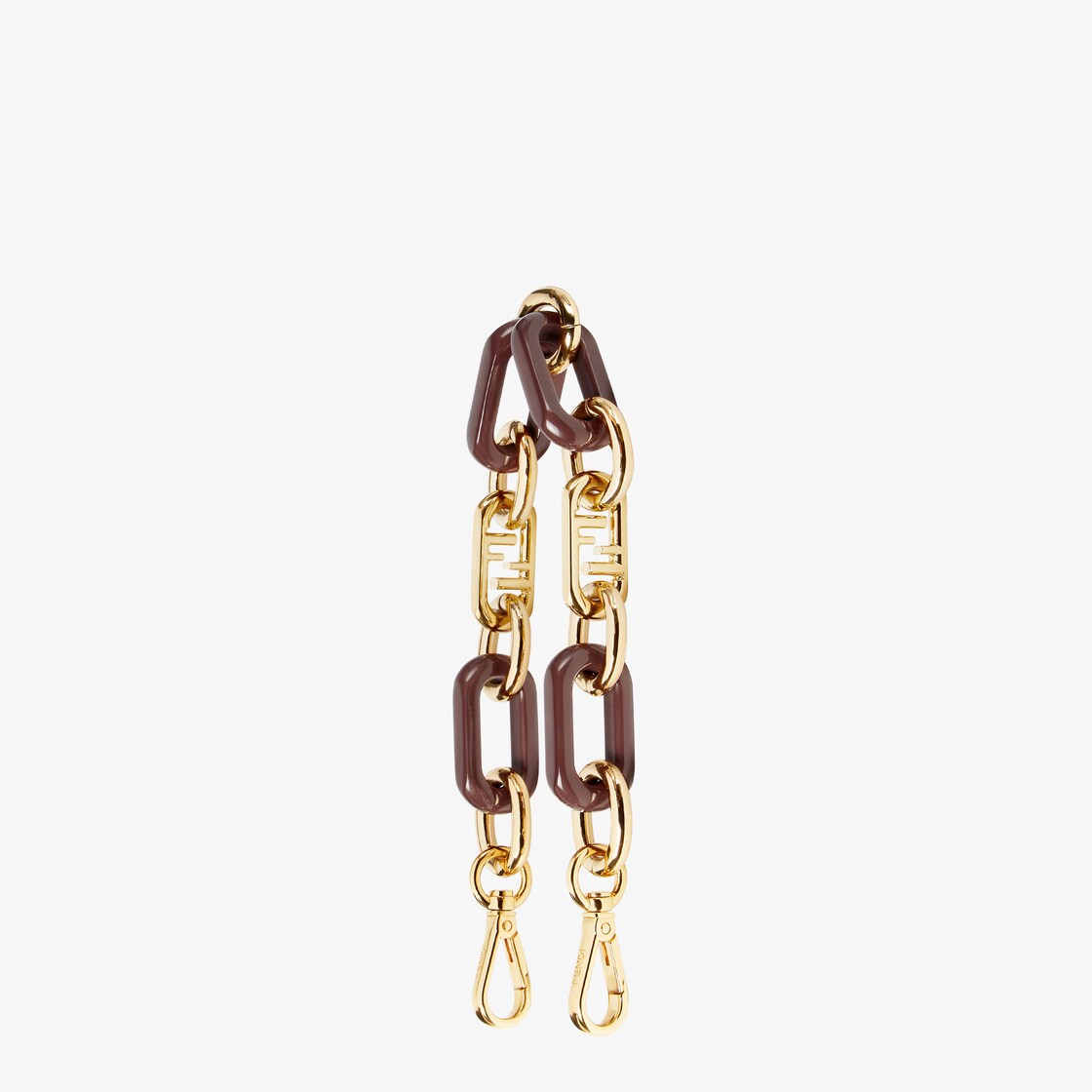 Short chain shoulder strap with double snap hook, to use in combination with any bag with hooks. Made of gold-finish metal, it features customised FF chain links alternating with mahogany brown ABS links.