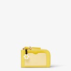 FF Diamonds card case pouch with two side zips. Made of broom yellow full-grain leather, with front card pocket in smooth light yellow leather. Tone-on-tone leather zip-pull decorated with FF Diamonds element and multicolour beaded flower detail. Completed with a snap hook to attach it to bags. Gold-finish metalware.
