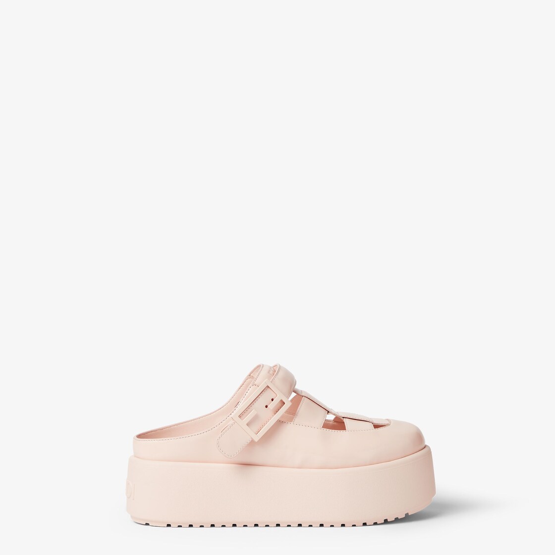 Sabots with rounded toe and platform sole. Made of pink patent nappa leather. Band decorated with a tone-on-tone FF Baguette accessory on the instep, which can also be worn on the heel. Ultra-lightweight chunky tone-on-tone rubber sole with Fendi lettering on the heel.