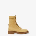 Lace-up Fendi Filo combat boots with round toe. Made of light ochre water-resistant nubuck leather embossed with the iconic FF motif tone-on tone. Fastening with two-tone hiking laces and metal eyelets. Decorated on the back by the Selleria Metal Stitch in a gold-finish. Rubber sole and heel with Fendi lettering on the side.