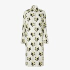 Midi shirt dress with classic shirt collar and long raglan sleeves. Garment fit can be modified to create a puffed silhouette using the elastic strap inserted in the back with buttonhole adjustment. Concealed front fastening with mother of pearl buttons. Made of white silk jacquard. Features the collection’s Fendi Bouquet motif printed all over in black and yellow.