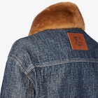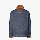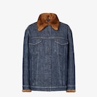 Boxy, cropped blouson, with shirt collar and long sleeves. Button fastening and two central pockets. Made of dark blue denim with all-over quilted FF motif. Contrasting tobacco-coloured stitching. Embellished with fur details on collar and front.
