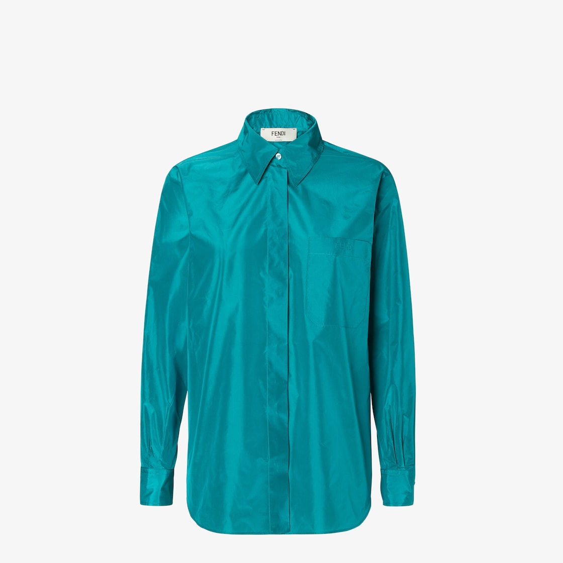 Oversized classic shirt. Long sleeves with dropped shoulders and shirt cuffs. Rounded asymmetric hem. Concealed button fastening. Made of light blue silk taffeta.