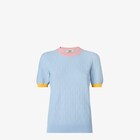 Jumper with crew neck and short sleeves. Embellished with ribbed edges. Made of light blue cotton and silk yarn with the iconic FF motif lightly embossed all over in the same tones. Contrasting cuffs and crew neck in pink and yellow.