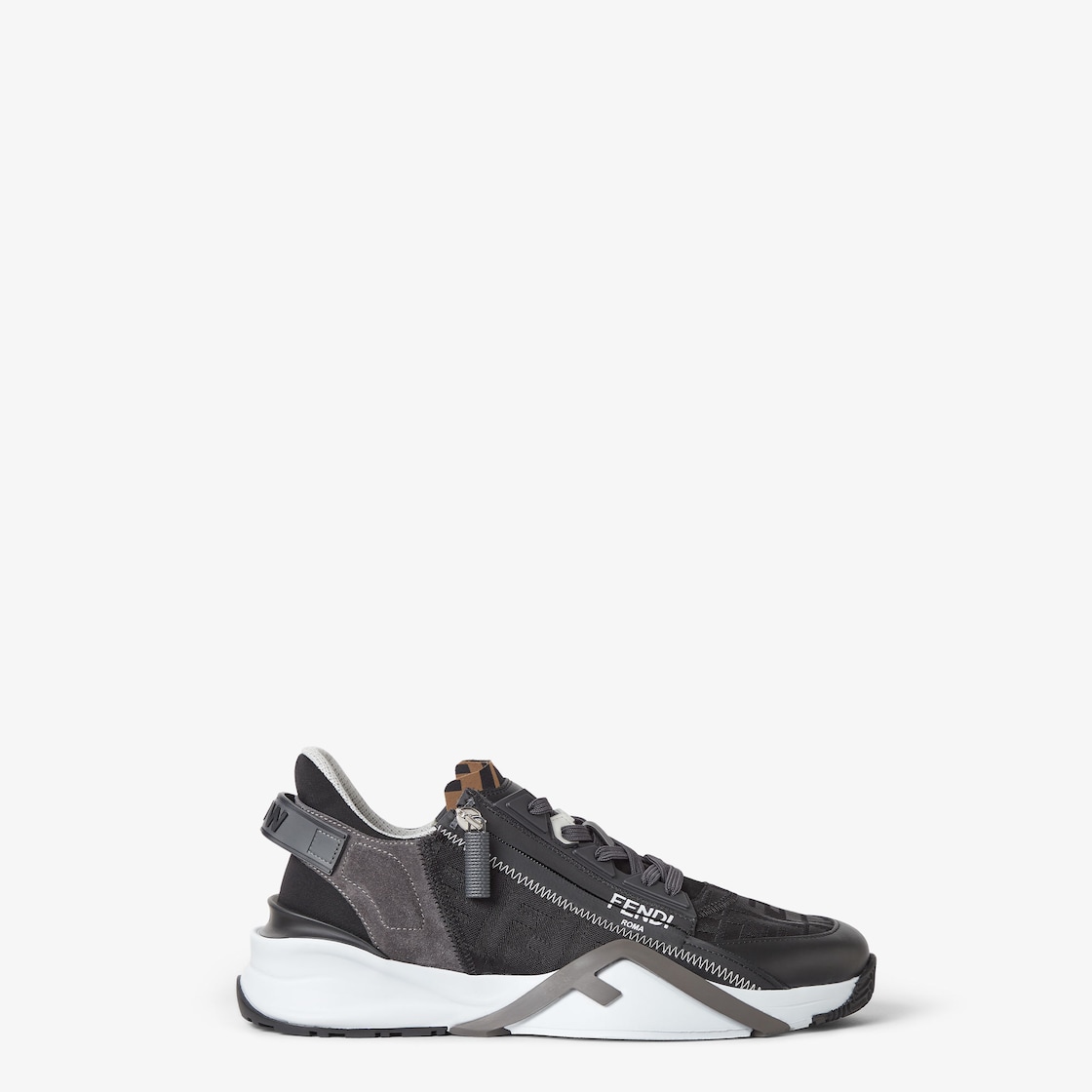 Slip-on trainers with elasticated laces, side zip and corrugated soles with engraved F. Fendi Flow lettering embossed on the heels. Made of black FF Jacquard nylon. Black leather and grey suede details. Embellished with Lycra® details with FF motif. White rubber soles with grey diagonal F detail.
