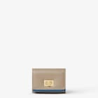 Compact Fendi Way mini wallet with twist lock. Features a large internal banknote compartment, two flat pockets, 4 card slots and an external coin purse with a press-stud closure. Made of mahogany brown leather with petunia pink interior. Gold-finish metalware.