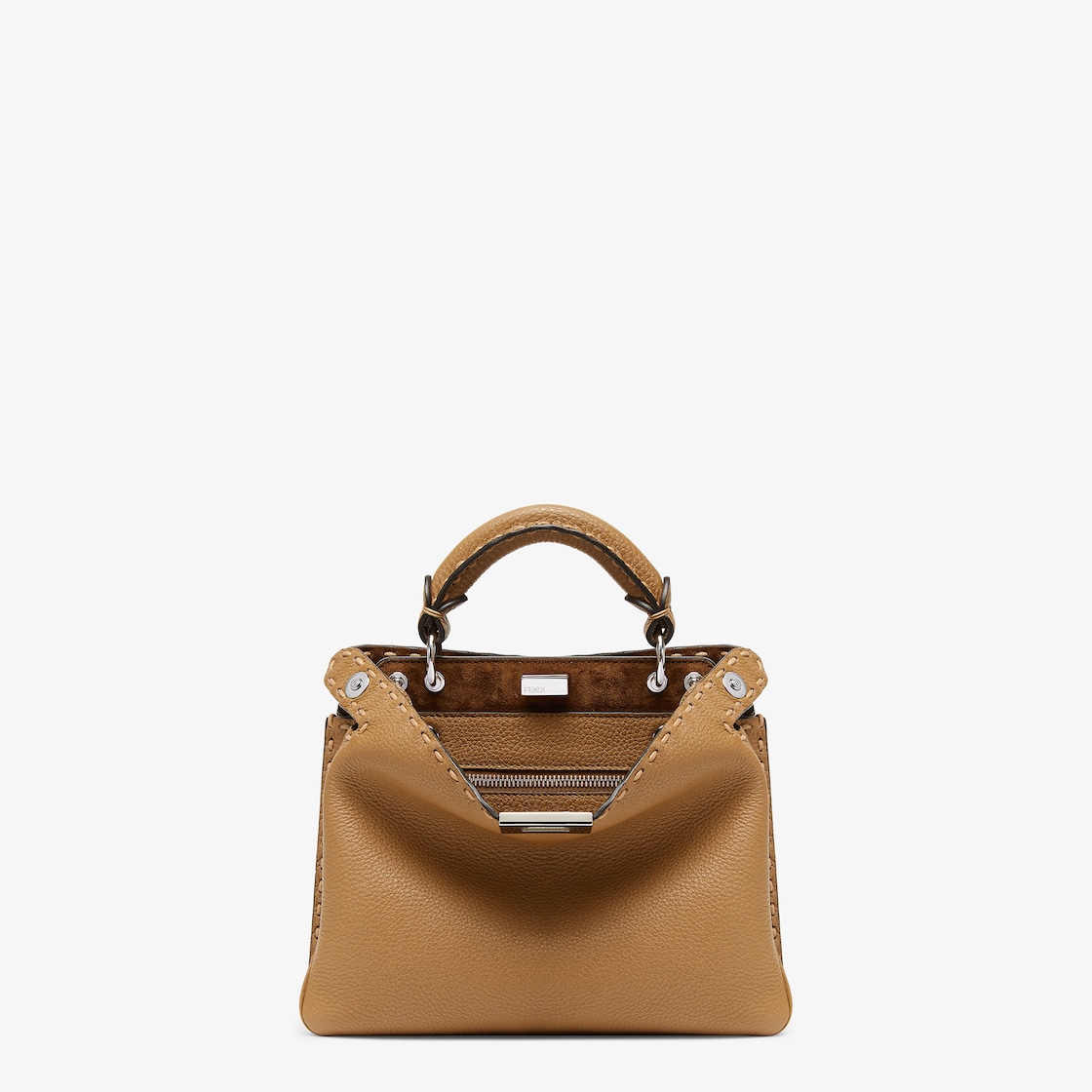 Small Peekaboo Soft bag with a lightweight, flexible construction, made of beige Cuoio Romano leather and finished with 476 hand-sewn tone-on-tone macro topstitches, an emblem of the iconic Selleria workmanship handed down through generations of Fendi artisans since 1925.