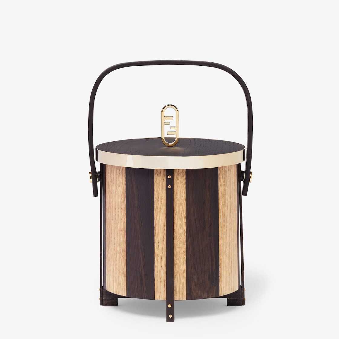 Inlaid wooden ice bucket with Pequin stripe pattern. The design of the lid with F O'Lock knob and gold-coloured metal embellishments create an iconic common thread with the aesthetics of the fashion house. A union of craftsmanship and design, the Fendi Casa accessories range offers unique and sophisticated objects created to make every dining experience special.