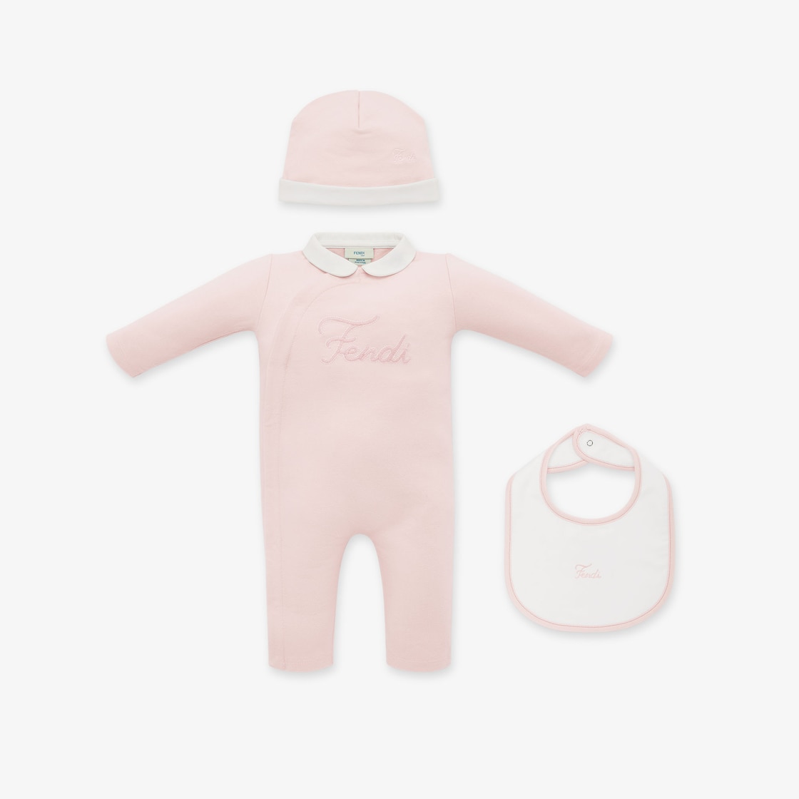 Pink stretch jersey-fleece baby set with hat and bib. Footless playsuit with tone-on-tone Fendi embroidery on the front.