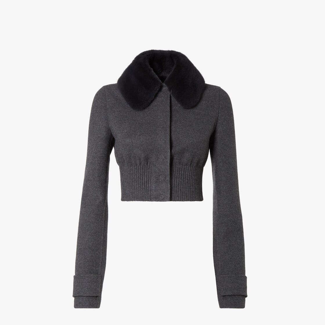 Cropped jacket with wide elastic edge at the hem. Shirt collar and long sleeves with cuff straps. Concealed front fastening. Made of light grey mélange double-faced cashmere. Detachable black mink fur collar.