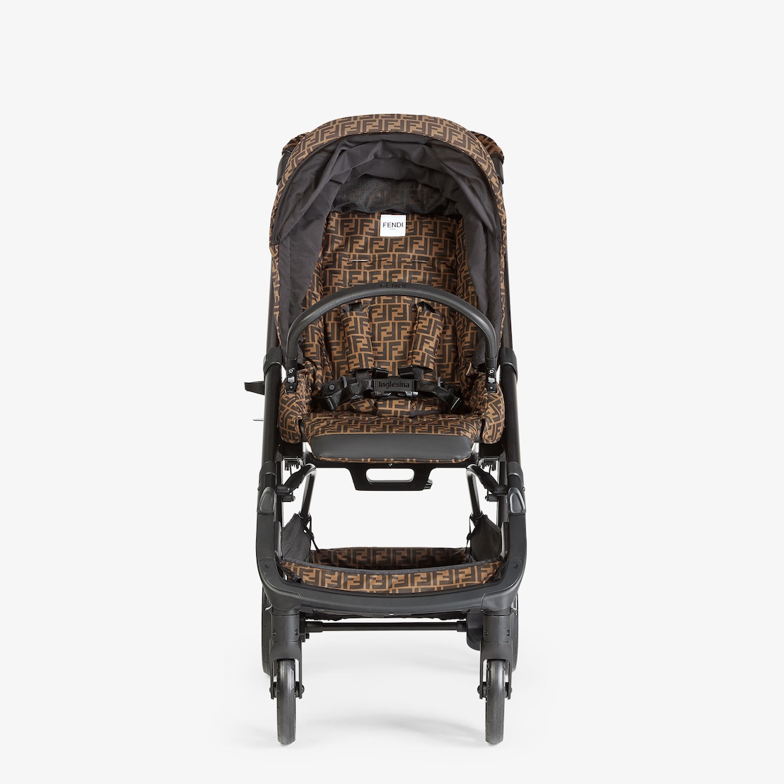 Reversible flame-retardant pushchair suitable from birth to up to 25 kg, in all-over FF logo fabric and sheepskin frame handle. Generous seat that can recline in 6 positions. Full-cover hood with SPF 50+ protection and net ventilation insert. The pushchair cover is fully removable and washable.
