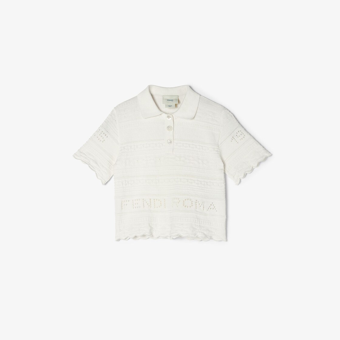 White junior polo shirt in a cotton broderie anglaise knit with Fendi Roma 1925 motif.