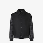 Cropped blouson with shirt collar and long sleeves. Vertical welt pockets on the sides. Press stud fastening. Made of black wool felt, with contrasting FF sleeves in black and grey. Finished with collar, cuffs and hem in stretch, stripe-motif rib knit.